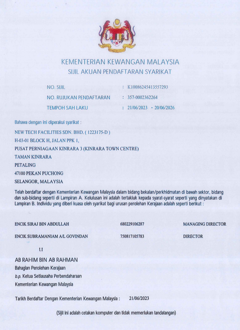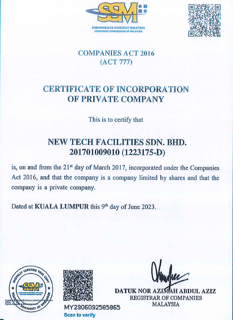 Welcome to New Tech Facilities Sdn Bhd. How may we help you?