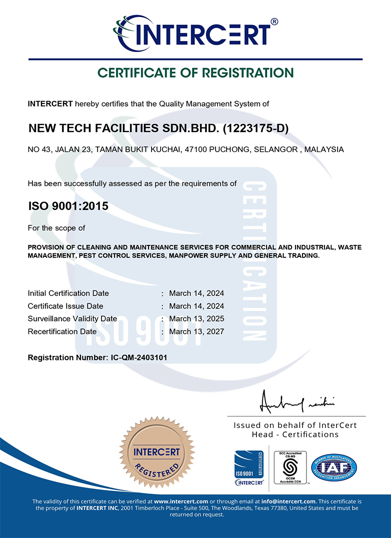 New Tech, the brainchild of two partners who garner over 15 years of experience each in the industry of hospitality; sharing equal passion & vision for the art in cleaning and a well-managed environment. This interest has grown to a team of 500 employees today with rapid growth of building’s undertaken for their facilities management & commercial cleaning services. New Tech is strong in building facilities management (Building Management / Facilities Cleaning & Up-Keep). We currently manage over 30 location sites & we manage hospitals, clinics, hotels, shopping malls, condominiums, apartments, universities, schools & office buildings. 17 years of field experience has garnered a wide coverage of skill sets & fine tuning of cleaning service according to different industry requirements & the various maintenance services that are requested for.