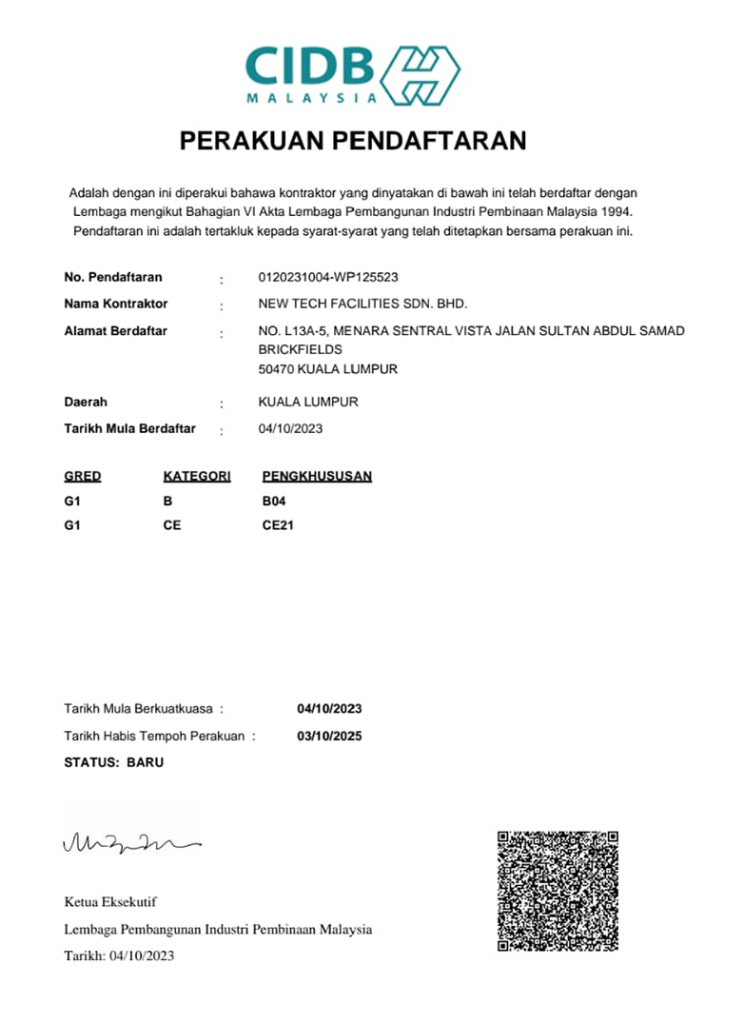Our policy is to cultivate passion in all work handled especially by our employees, thus proper training on the right methods of work, precisely written work schedules, regular health check ups & close monitoring on performance has benefited us in obtaining a yearly growth index. We pay our workers higher wage compared to local industry standards & introducing perks such as medical insurance, attendance bonus & career growth path within the company has resulted in a happy working environment in New Tech Facilities Sdn Bhd.